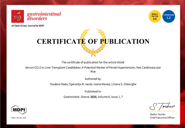 This article is part of a doctoral research project coordinated by Professor Liliana Gheorghe and contributes to the understanding of inflammatory markers in advanced liver disease. The study’s main finding shows that serum CCL5 is associated with portal hypertension rather than cardiovascular risk in liver transplant candidates, suggesting a more liver-specific pathogenic role for this chemokine.